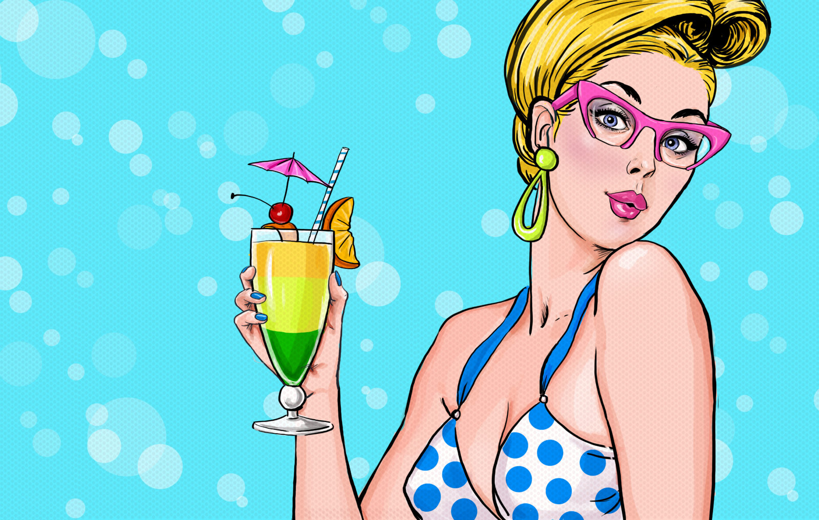 Pop Art illustration of blond girl with cocktail. Pop Art girl. Party invitation. Birthday greeting card.Hollywood movie star.Vintage advertising poster. Comic woman with cocktail. Sexy party girl